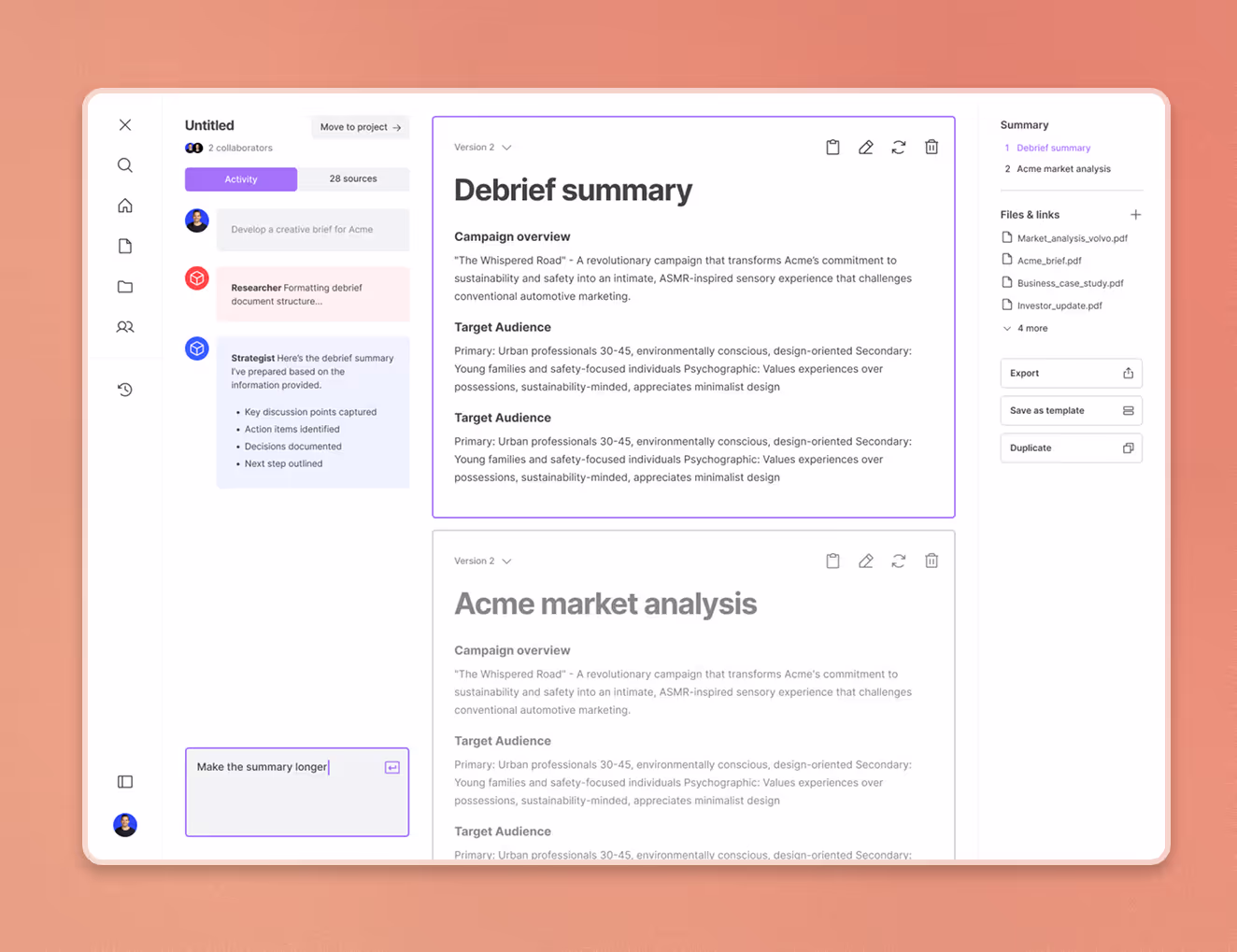 Transform your creative process with the world’s first Creative Operating System™ - built specifically for creative agencies. Our collaborative AI workspace integrates AI agents into every stage of your unique workflows, from research and insights to strategy and creative execution.